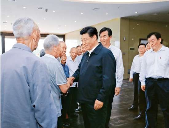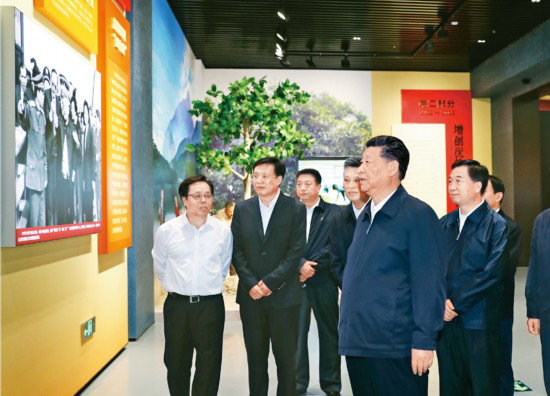 2019年5月20日至22日,中共中央总书记、国家主席、中央军委主席习近平在江西考察,主持召开推动中部地区崛起工作座谈会并发表重要讲话。这是习近平在赣州市于都县中央红军长征出发纪念馆会见于都县的红军后代、革命烈士家属代表。 新华社记者 鞠鹏/摄
