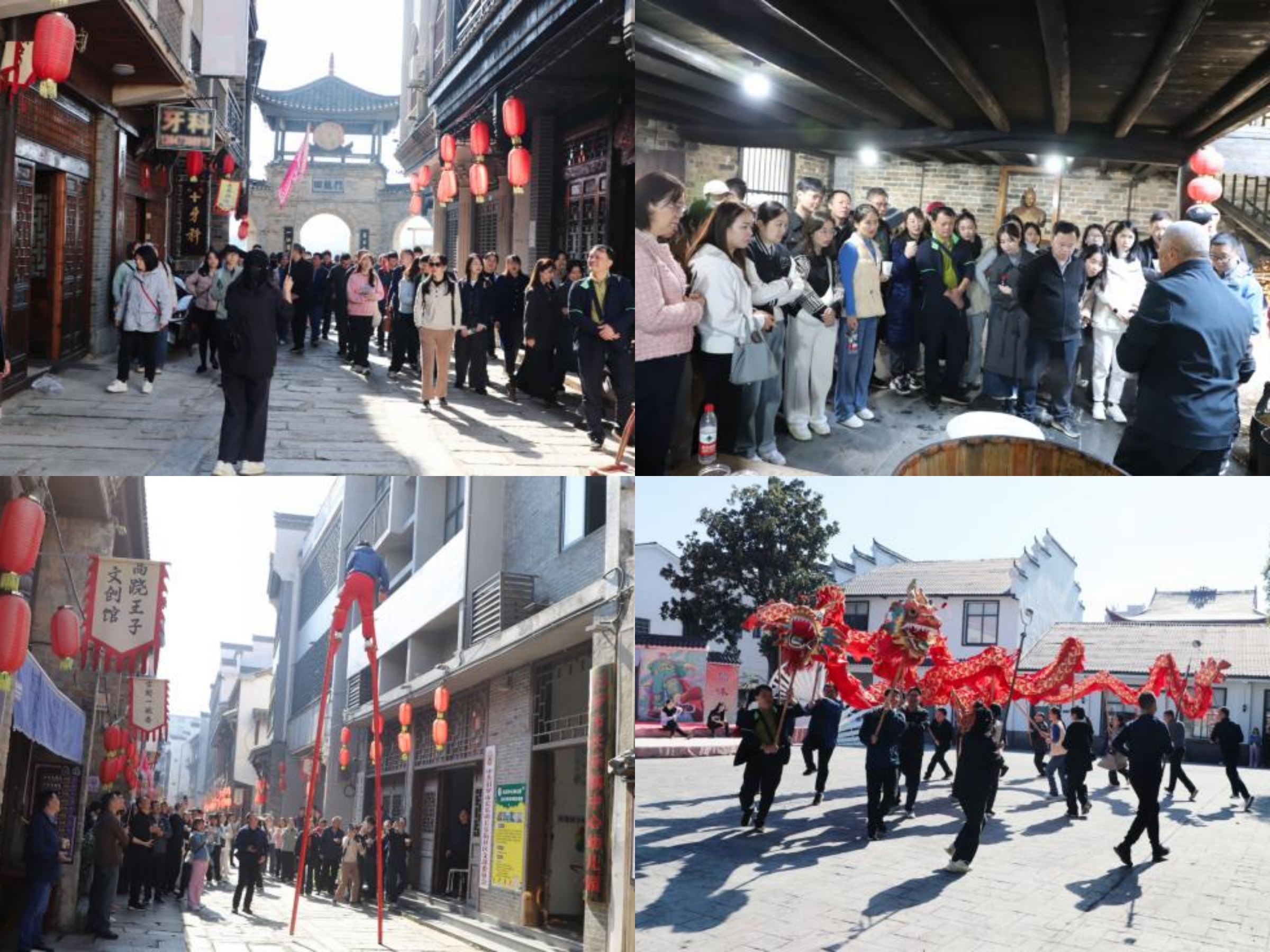 在长乐镇,干部职工们漫步古镇赏秋景,参观甜酒古法制作、高跷表演,体验舞龙等传统非遗项目。